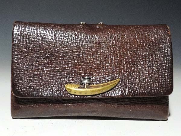 - 【桃】提げ物:金工銅地鍍金渡り舟に鷺金具革製煙草入れ