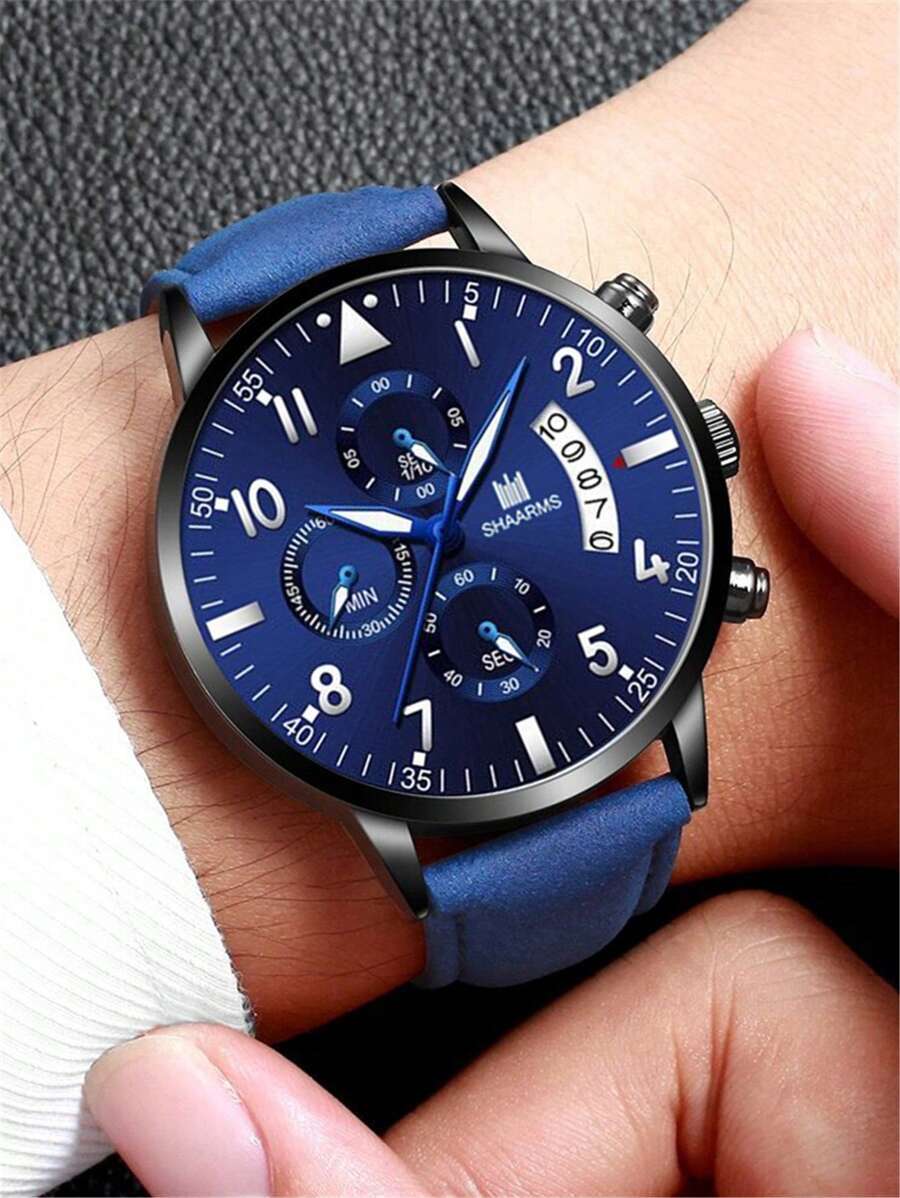 - 腕時計 メンズ クォーツ 1個 ブルー メンズ腕時計 PUレザーストラップ ビジネス デイト ラウンドダイヤル クォーツ式、学生へ