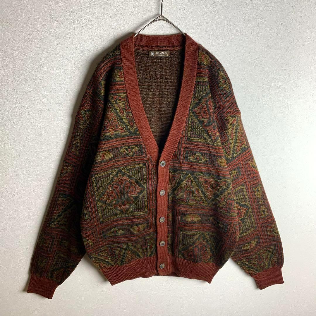 - ニットカーディガン セーター 民族柄 バティック柄 総柄 ボルドー バーガンディ カジュアル おしゃれ メンズ ユニセックス 古着