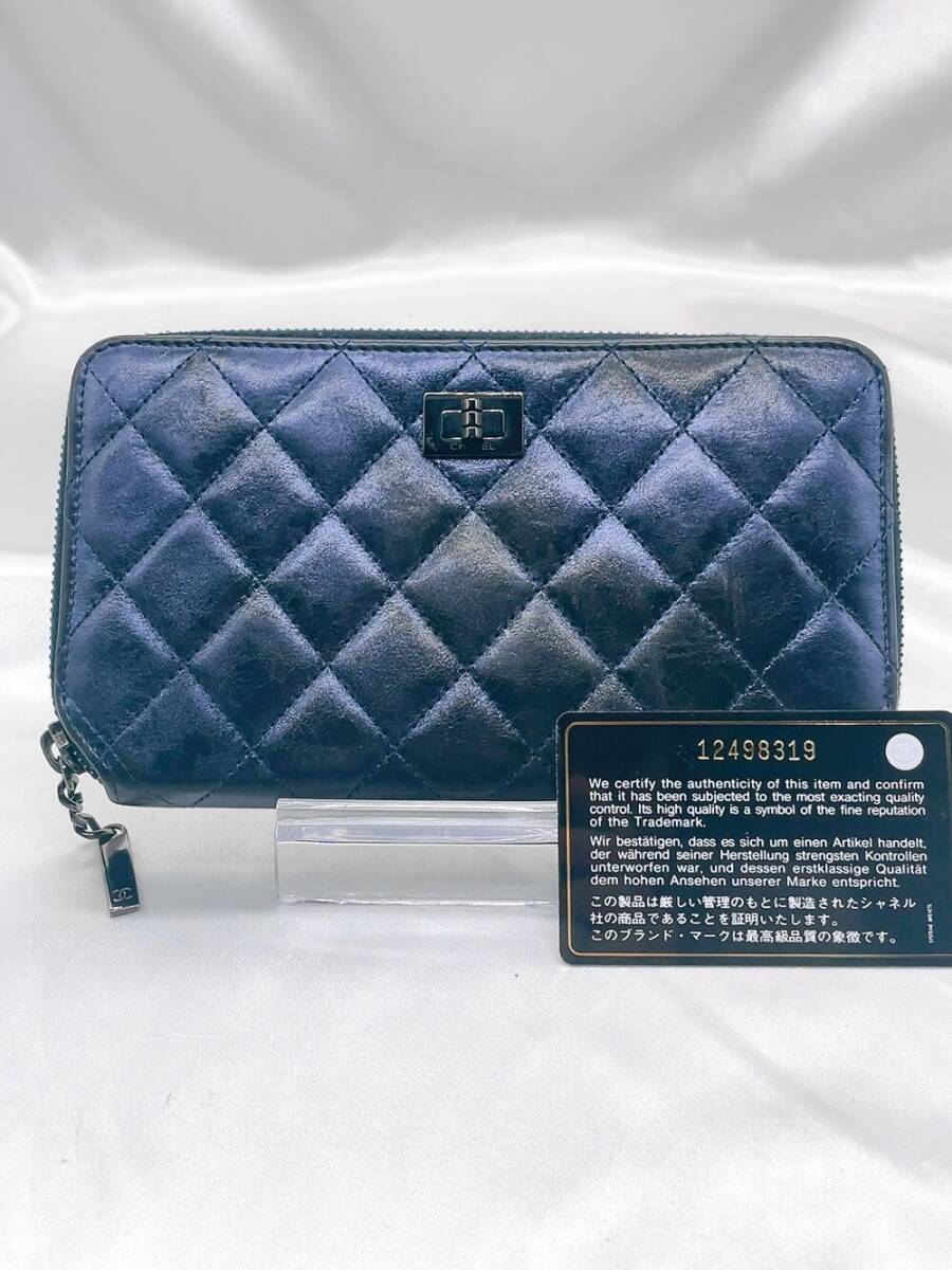 > CHANEL マトラッセ ココマーク ロングウォレット ジッピーウォレット メタリックブルー レザー ラムスキン カード付き