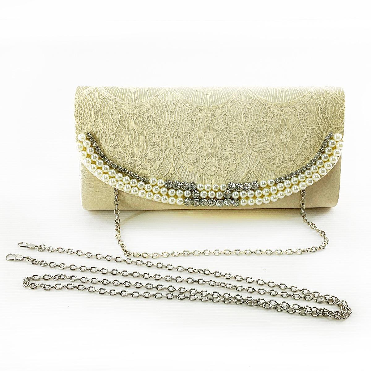 - レースxパール パーティーバッグ クラッチ チェーン付き ベージュ