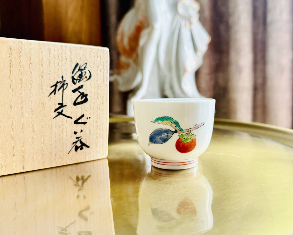 - 人間国宝14代 柿右衛門 濁手 「柿文ぐい呑」・本物保証・新品同様・共箱等の一式全揃い 陶磁器