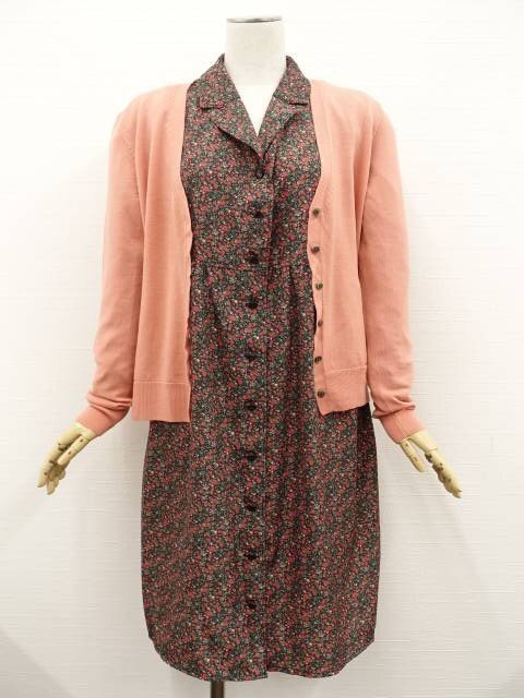 > 美品 UNIQLO等 長袖カーディガン+膝丈ブラウスワンピース コーデ2点セット L相当 ピンク/黒地 小花柄 きれいめ・フェミニン系 20代~30代