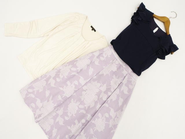 > 美品 index等 長袖&ノースリーブカットソー+膝丈ボックススカート コーデ3点セット M 白系/紺/紫地 シルバー 葉 きれいめ系 30代・40代~