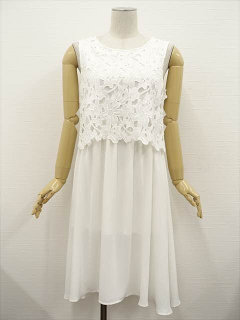> 美品 エムズエキサイト Emsexcite ロング丈 ラウンドネック レースノースリーブワンピース M ホワイト&ホワイト 花柄