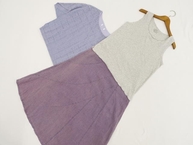 > 美品 studio CLIP等 ノースリーブカットソー+五分袖カットソー+ロング丈スカート コーデ3点セット M相当 グレー杢/紫 カジュアル系 30代~