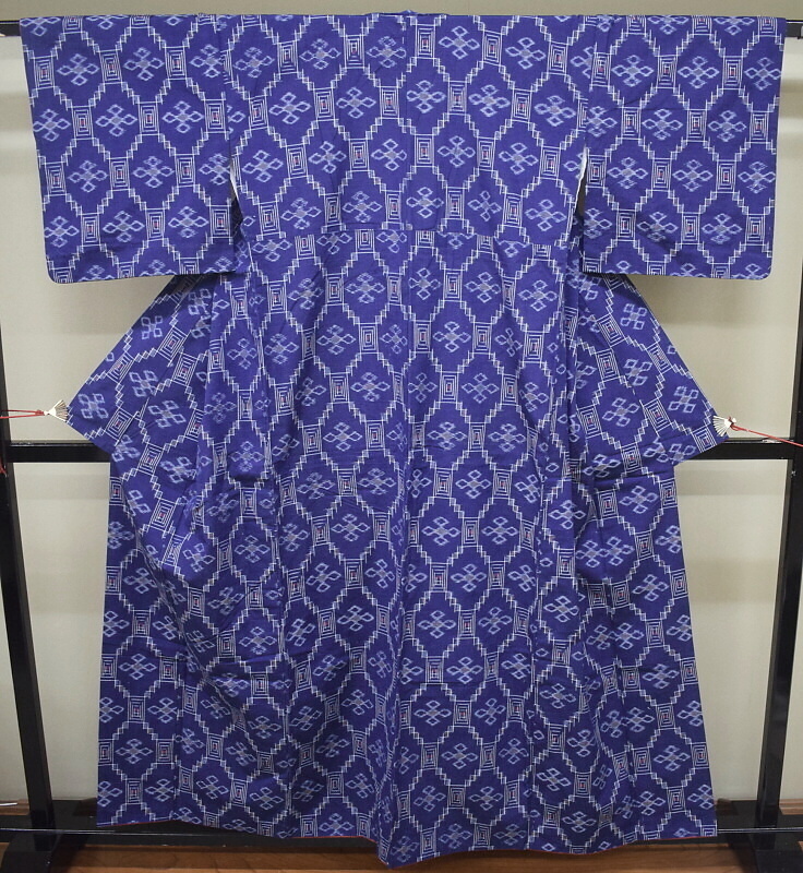 > B20-10【凛々】中古品 綿 琉球絣の着物 紺 菱柄 身丈158.5 裄66