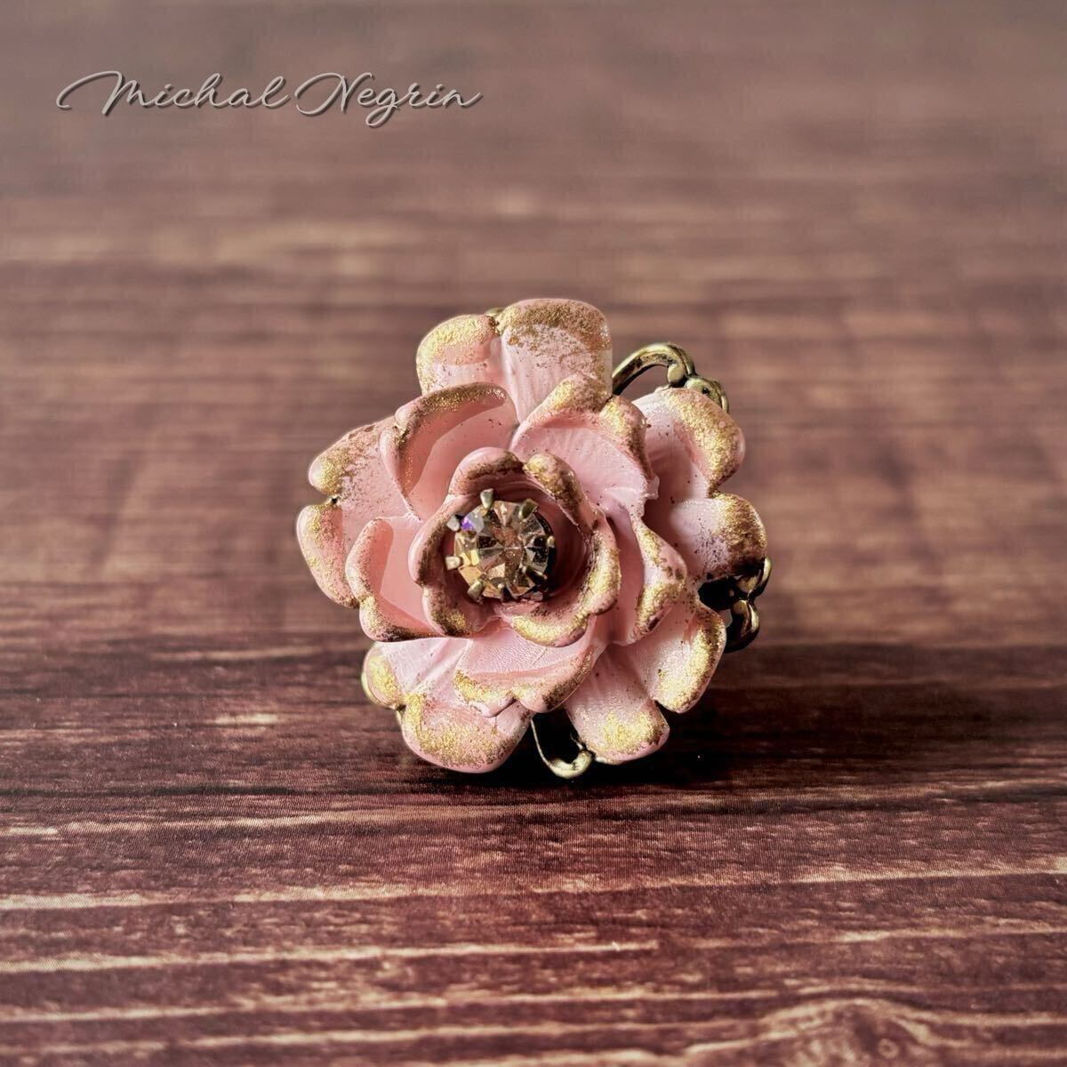 > フリーサイズ Michal Negrin ミハエルネグリン 薔薇 ローズ 指輪 リング ピーチピンク コーラルピンク アンティークゴールド クラシック