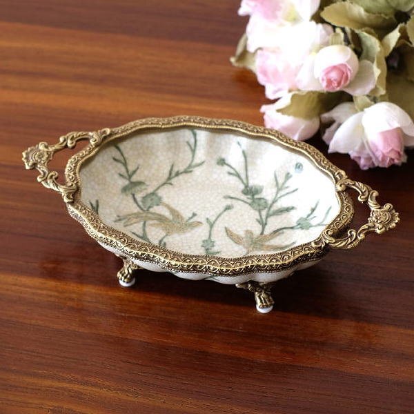- 陶器 プレート 小物入れ おしゃれ トレイ シンプル 真鍮 シノワズリ 真鍮と陶器のオーバルプレート バード 送料無料(一部地域除く) ebn4042