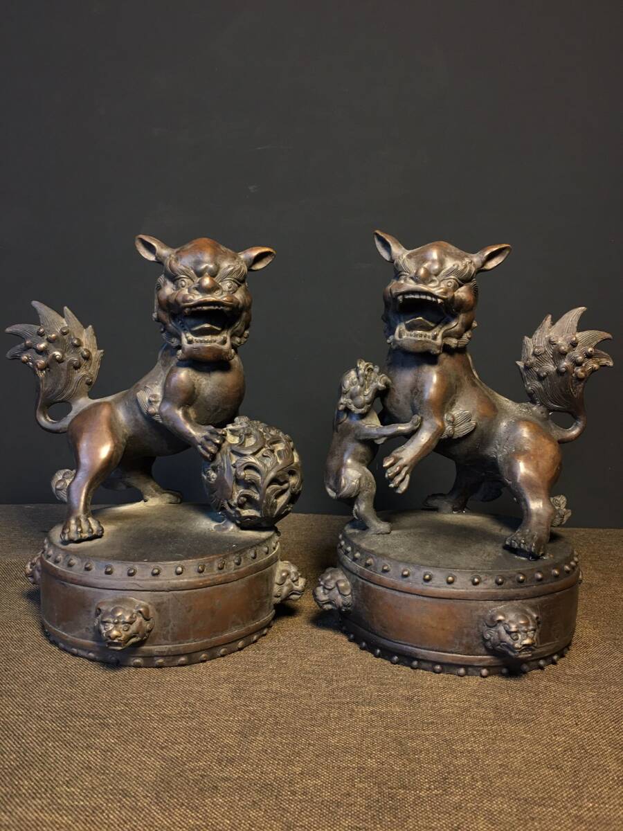 - ◆珍蔵◆中国古美術 清時代 古銅製 銅胎 獅子戯球―對 細密細工造 置物 擺件 古賞物 骨董品 時代物 A17