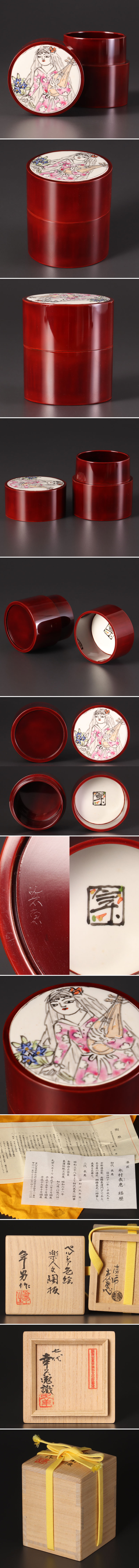 > 【古美味】人間国宝 加藤卓男作/塗師 木村表恵 ペルシア色絵楽人文陶板 中次茶器 七代加藤幸兵衛識 茶道具 保証品 1BJn