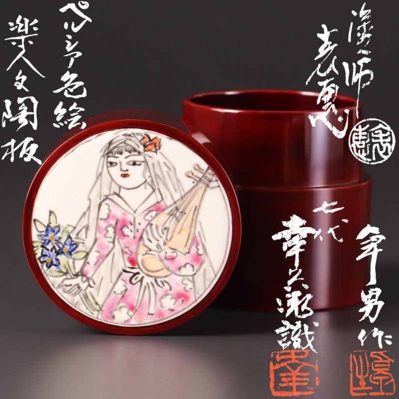 - 【古美味】人間国宝 加藤卓男作/塗師 木村表恵 ペルシア色絵楽人文陶板 中次茶器 七代加藤幸兵衛識 茶道具 保証品 1BJn