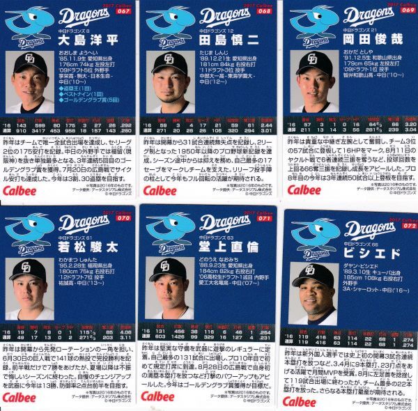 - ●2017カルビー【大島,田島,岡田,若松,堂上,ビシエド】通常版全6種セット 067~072:中日