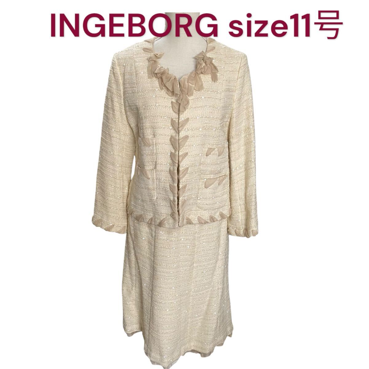 - インゲボルグ ツイード ノーカラー セットアップ スーツ 11号、L INGEBORG ノーカラージャケット