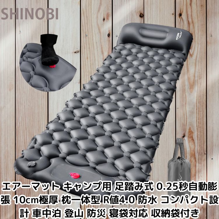 > エアーマット キャンプ用 足踏み式 10cm極厚 枕一体型 R値4.0 防水 コンパクト設計 車中泊 登山 防災 寝袋対応 収納袋付き グレー