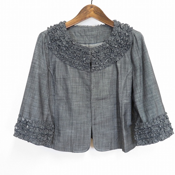 > #a ギャラリービスコンティ GALLERY VISCONTI ジャケット 七分袖 2 黒系 デニム調 インディゴ染め フリル ノーカラー 美品 920627 k01