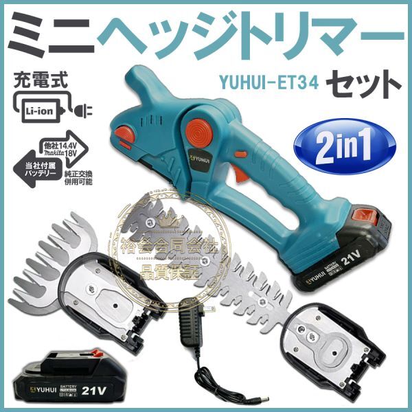 > ★送料無料・30日間保証付き★芝刈り機 芝生バリカン 二合一 ミニヘッジトリマー 充電式 生垣バリカン コードレス 軽量 21Vバッテリー2個付