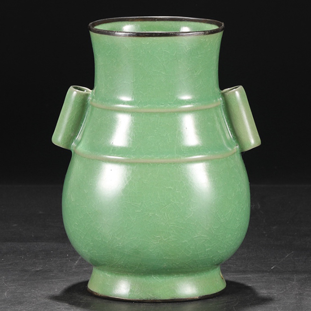 - ▽鴻▽北宋時代 陶磁器 汝窯天青釉氷片紋包銀口宮廷御用貫耳瓶 共箱 時代物 中国古美術 骨董品