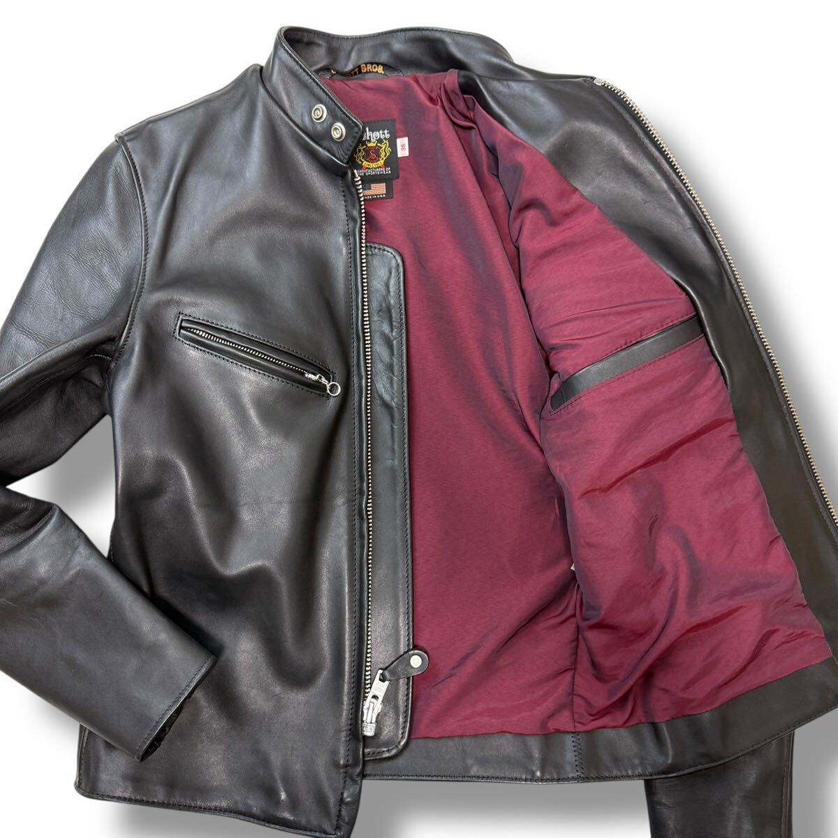 > 1201現行◎ほぼ未使用!schott ショット 641xx シングルライダースジャケット レザージャケット 革ジャン ボルドー裏地 黒 ブラック 36 牛革