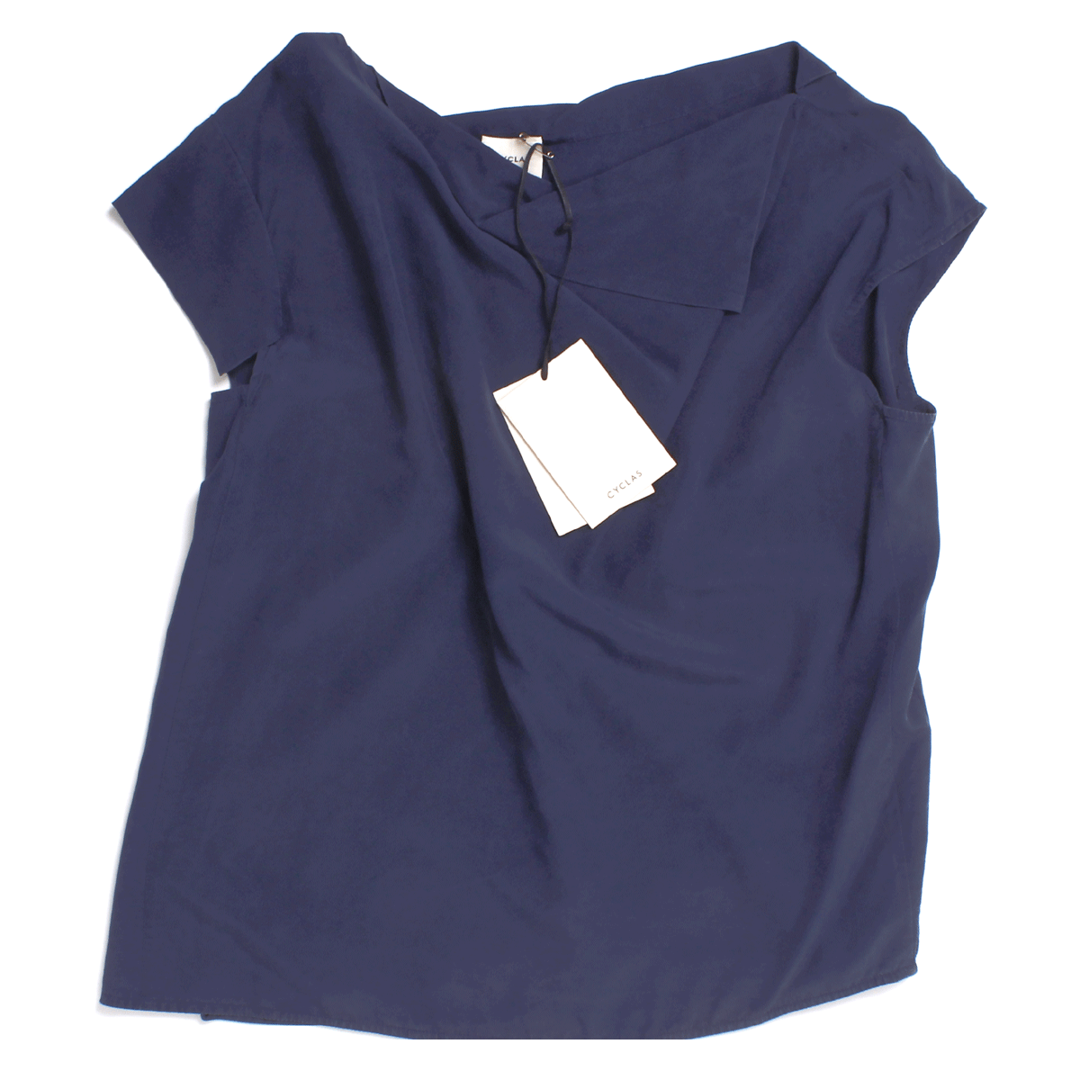 > 【タグ付き・定価49,000円】CYCLAS SILK SATIN ASYNMETRY TOP size34 紺 1-01-04-2008 シクラス アシンメトリー ノースリーブ トップス