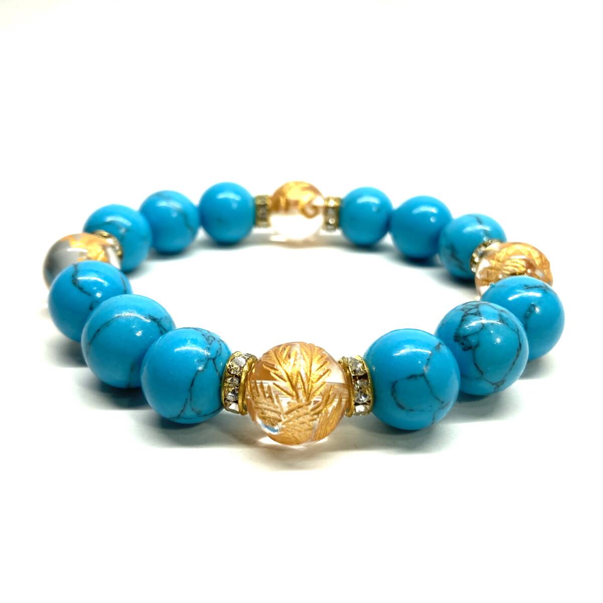 - 四神獣金彫水晶×ターコイズ 12mm パワーストーン ブレスレット青龍 白虎 玄武 朱雀 運気上昇 お守り 金運 健康運 四神獸 四神相応 G #1