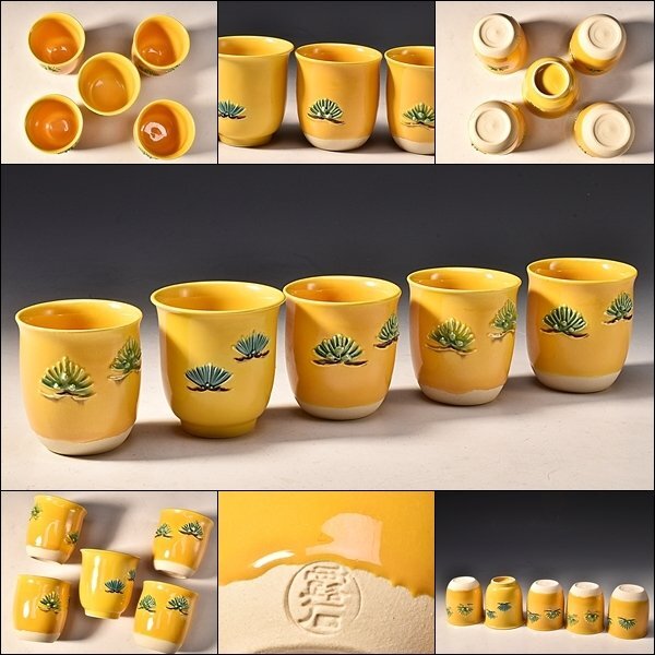 - SP5654 京焼 赤沢露石 黄瀬戸 杯 五客 盃 酒杯 ぐい呑 酒盃