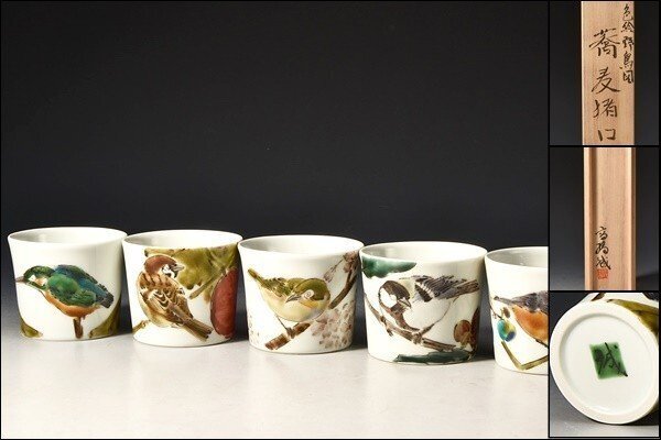 - U08206 東京芸大 高橋誠 色絵 野鳥図 蕎麦 猪口 酒器 盃 五客 共箱 /G72