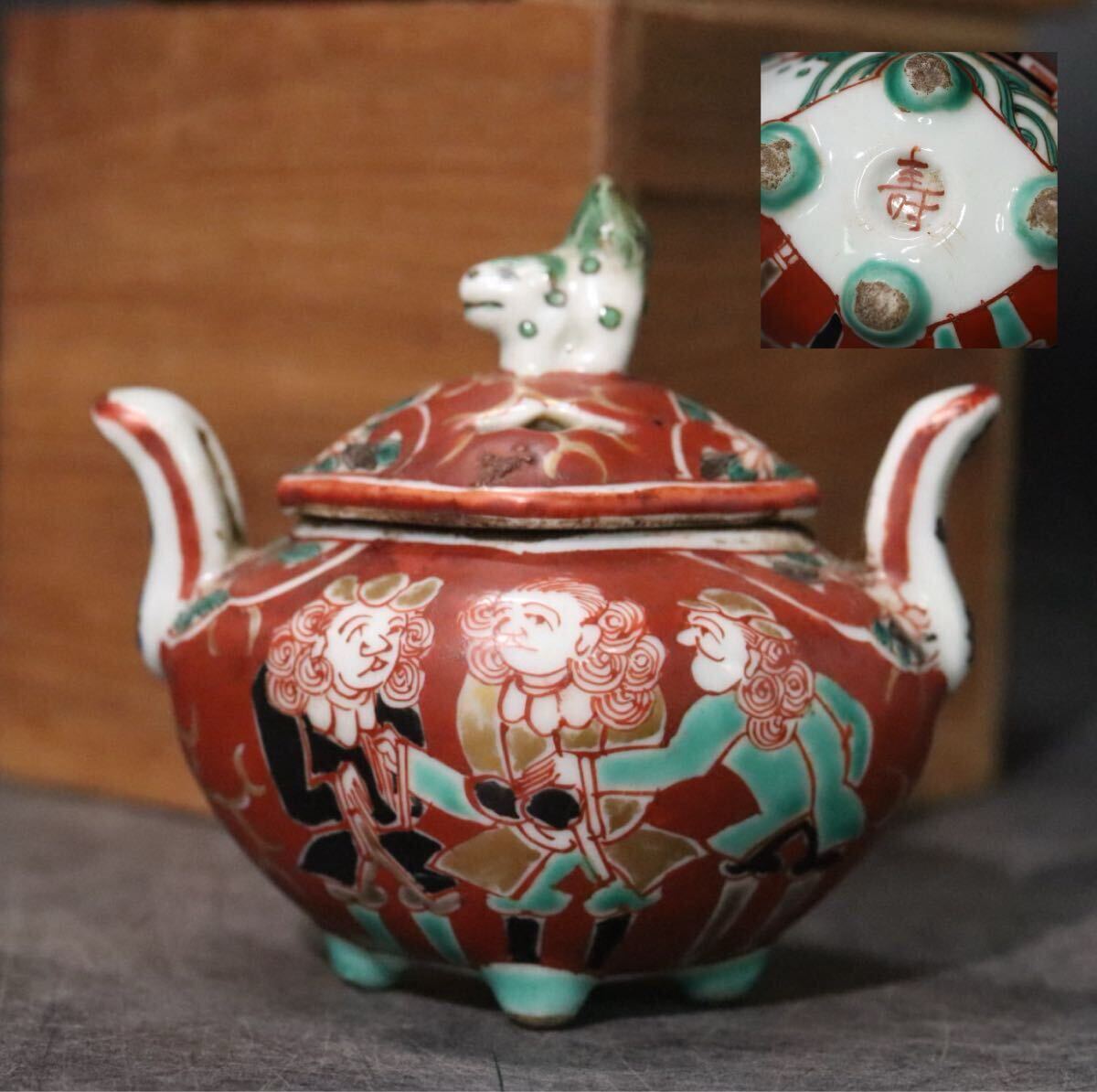 > 時代 九谷 壽 南蛮人 赤毛 図 赤絵 小型 獅子香炉 共箱付 高約6.5cm/ 色絵 磁器 検索: 古九谷 金襴手 .B1266