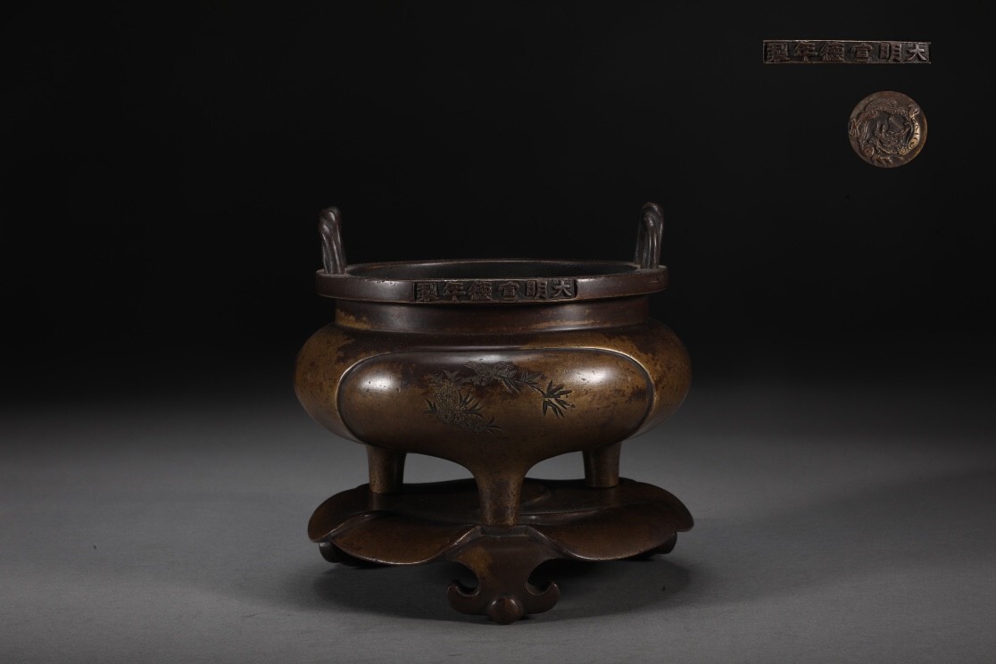 > 【永】明時代 大明宣德年製 古銅製 索耳鬲式爐 極細工 古銅彫 置物擺件 古美術品 古董品 収集 古美味 旧家蔵出 中国唐物 A6219