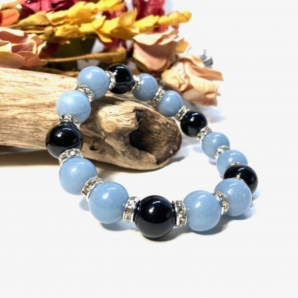 - エンジェライト&オニキス パワーストーン ブレスレット 天然石ブレス (シルバー) 12mm 幸運 開運 メンズ 男性♪