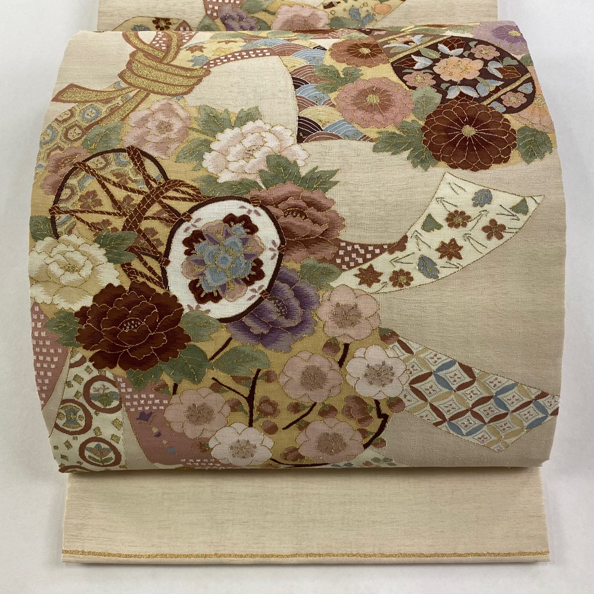 > 袋帯 逸品 束ね熨斗 鼓 金糸 ベージュ お太鼓柄 正絹 【中古】