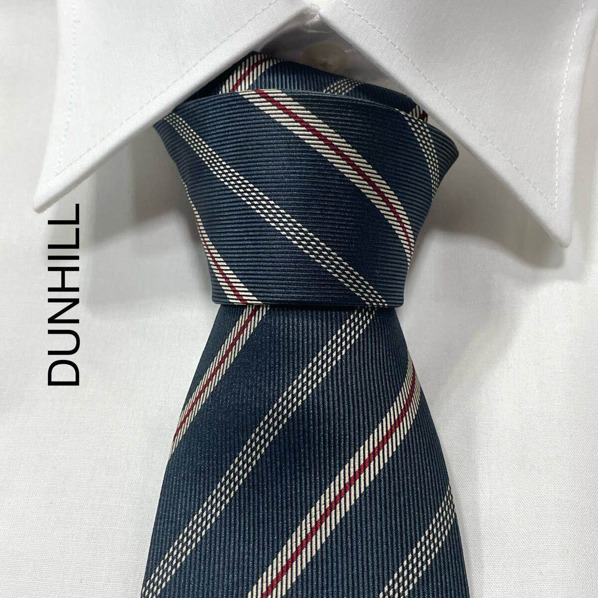 - DUNHILL ダンヒル ロゴ レジメンタル ストライプ ジャガード シルク ネクタイ イタリア製 ネイビーグレー TG3008