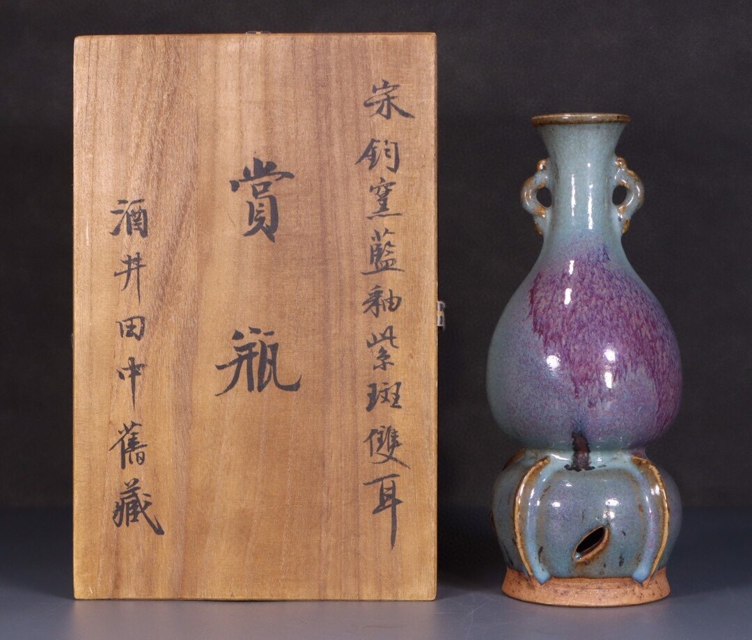 - ▽鴻▽南宋朝時代 陶磁器 鈞窯藍釉紫斑双耳賞瓶 時代木箱付き 染付 時代物 中国古美術 骨董品