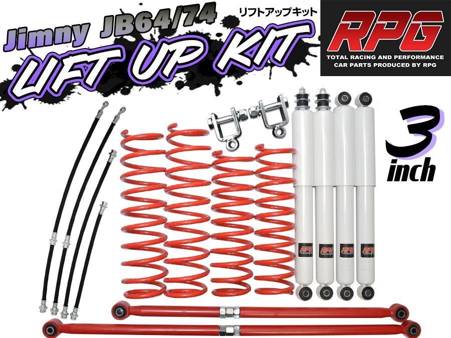 > ジムニー JB64W JB74W 3インチリフトアップキット RPGロングショック白 ラテラル赤 コイル赤 ロングブレーキホース ブラケット