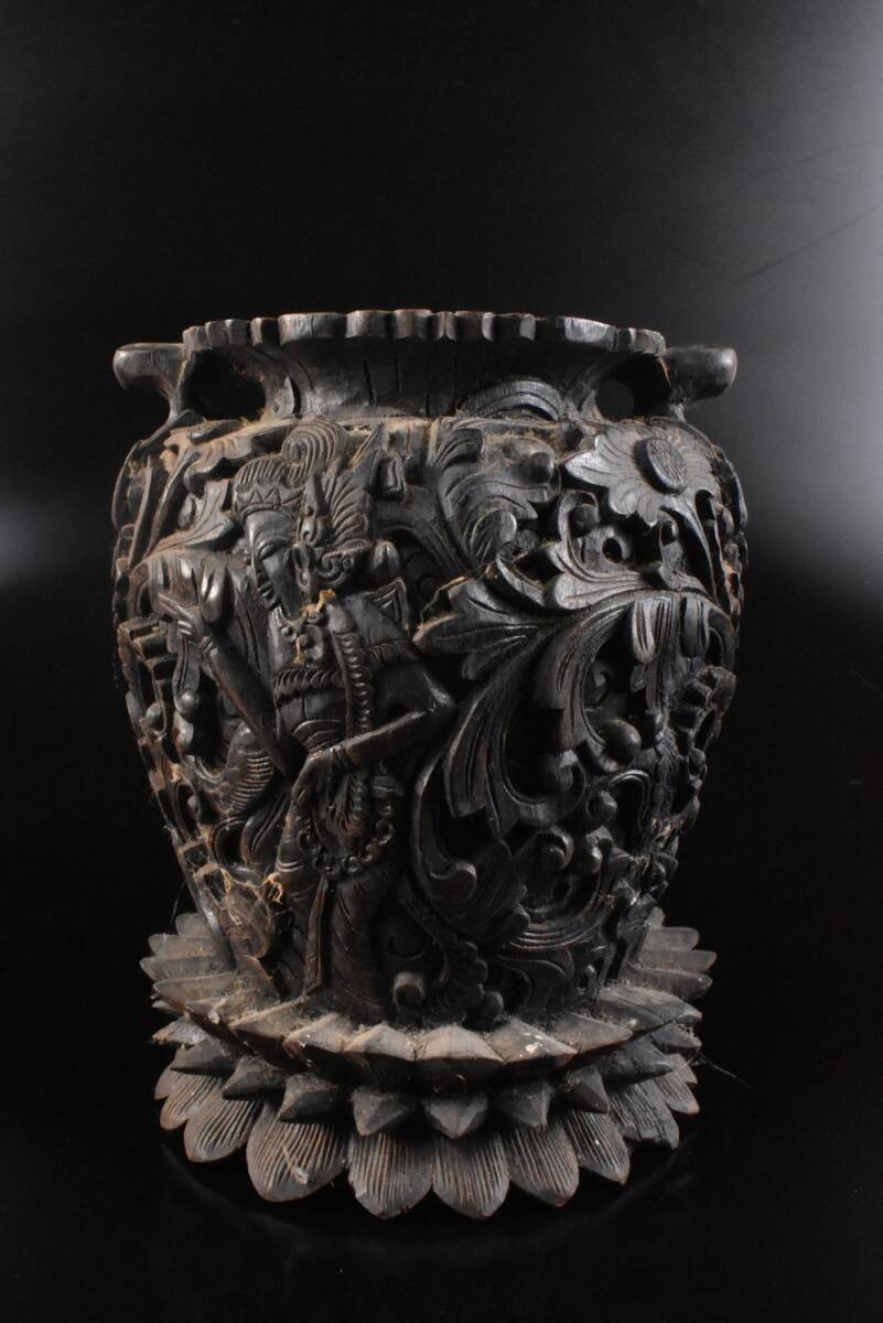 - 【雲】某有名資産家買取品 木製 花彫刻花瓶 古美術品(花器花入旧家蔵出) F8539