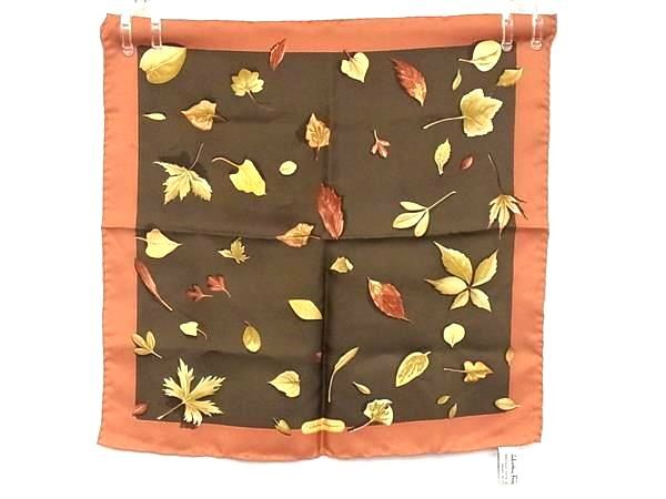 - Salvatore Ferragamo フェラガモ シルク100% リーフ 葉 スカーフ ポケットチーフ カーキ系×テラコッタ系 DH6417