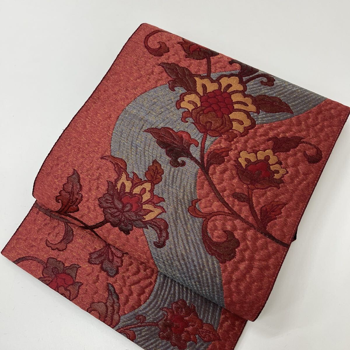 > 名古屋帯 ふくれ織り 花唐草 八寸 正絹 着物 Q-315