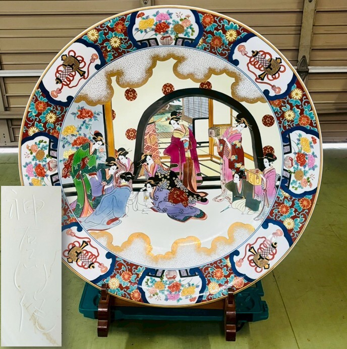 > 特大染錦色絵美人文飾皿 神右衛門 有田焼 細密絵付 作家 骨董 置物 飾物 日本伝統工芸品 芸術 古美術 時代物 絵皿 資産家所蔵 直接引取限定