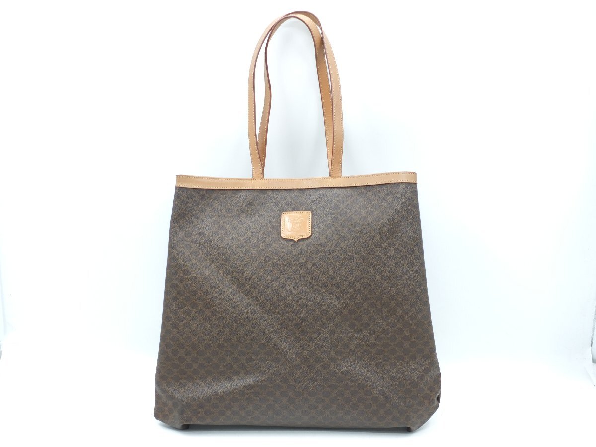 > 【z33358】CELINE セリーヌ マカダム トート バッグ PVC レザー ブラウン ゴールド 金具 ブラウン ヴィンテージ 格安スタート