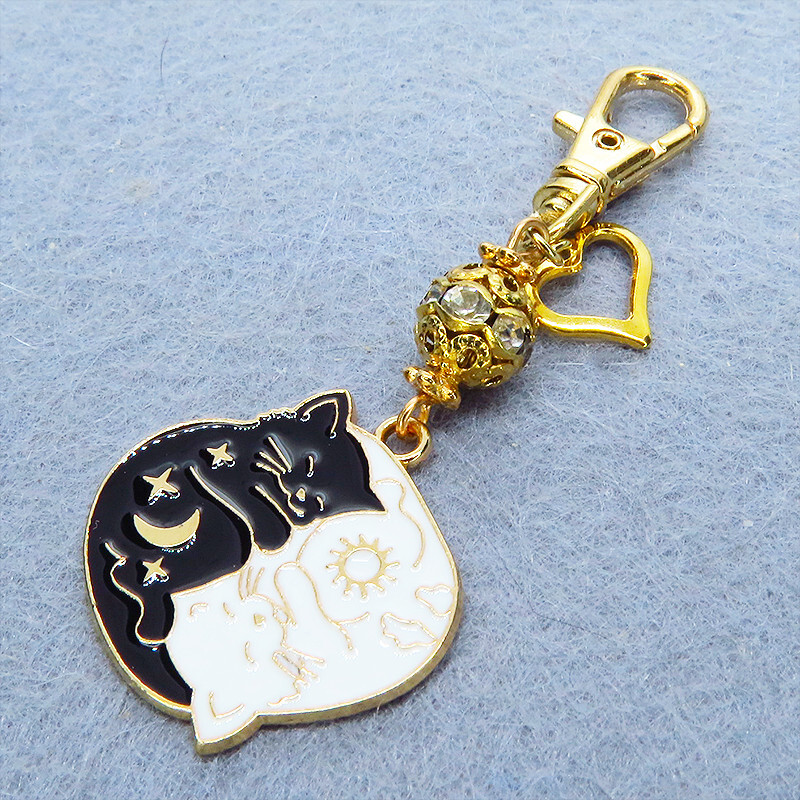 - マットゴールド 白猫黒猫丸まってお休みチャームのキーホルダー メタルビーズ 金具変更可