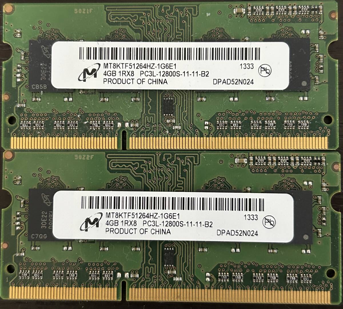 - 即決 動作確認済み Micron マイクロン SO-DIMM 204pin DDR3L PC3L-12800S 4GB×2枚1.35V低電圧対応 1.5V対応 ノートパソコン用 805