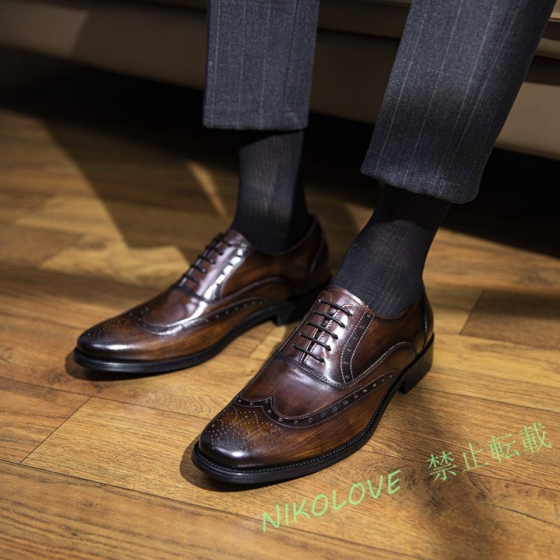 > ☆新品高級 牛革 本革 希少 手塗仕上げ彫り ビジネスシューズ 手作り メンズ レザーシューズ 24.5cm ~27cm コーヒー