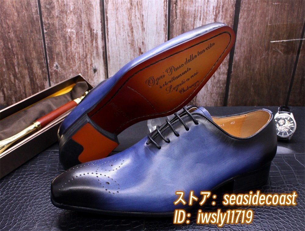 > 定価11万★超希少 ビジネスシューズ メンズ 職人手塗仕上げ 彫り 本革レザーシューズ 最高級 紳士靴 フォーマル 革靴 牛革 ブルー 26.5cm