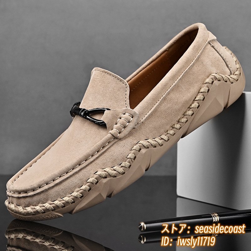> 新品■ドライビングシューズ メンズ 本革 ローファー スリッポン スエード革 牛革 レザーシューズ アウトドア 通気性 快適 ベージュ 26.0cm