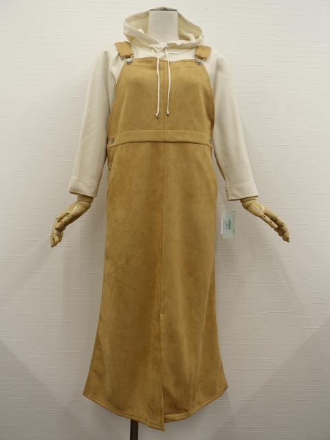 > 美品 style RAVIE LAND等 マキシ丈サロペットスカート+九分袖パーカー コーデ2点セット M相当 キャメル/アイボリー カジュアル系 20代