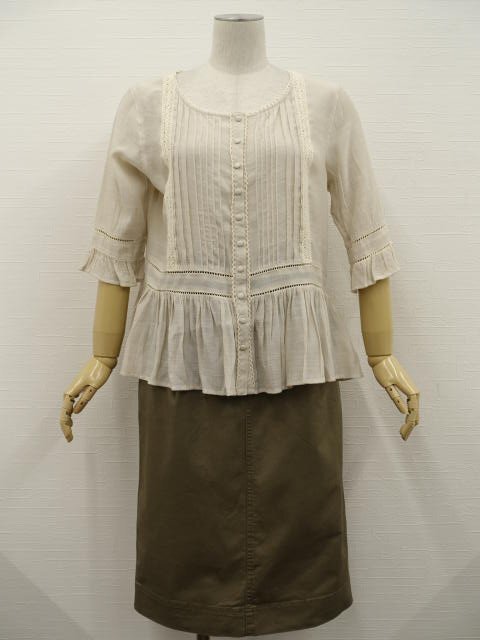 > 美品 UNIQLO等 七分袖ブラウス+膝丈ストレートスカート コーデ2点セット M相当 ベージュ系/緑系 ナチュラル・カジュアル系 20代・30代~
