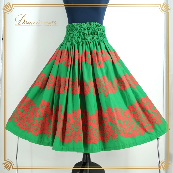 > フラダンス 衣装 パウスカート グリーン系 シングル フラ ダンス ハイビスカス柄 緑 赤 モンステラ柄 ハワイアン アロハ 鮮やか レッド系