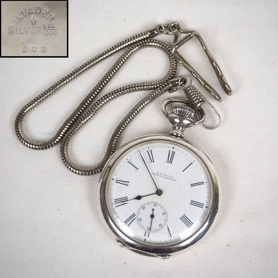 - 【金富士】値下げ中 明治時代 ウォルサム WALTHAM 銀無垢懐中時計 925/1000刻印 77g 手巻き 動作品 チェーン付