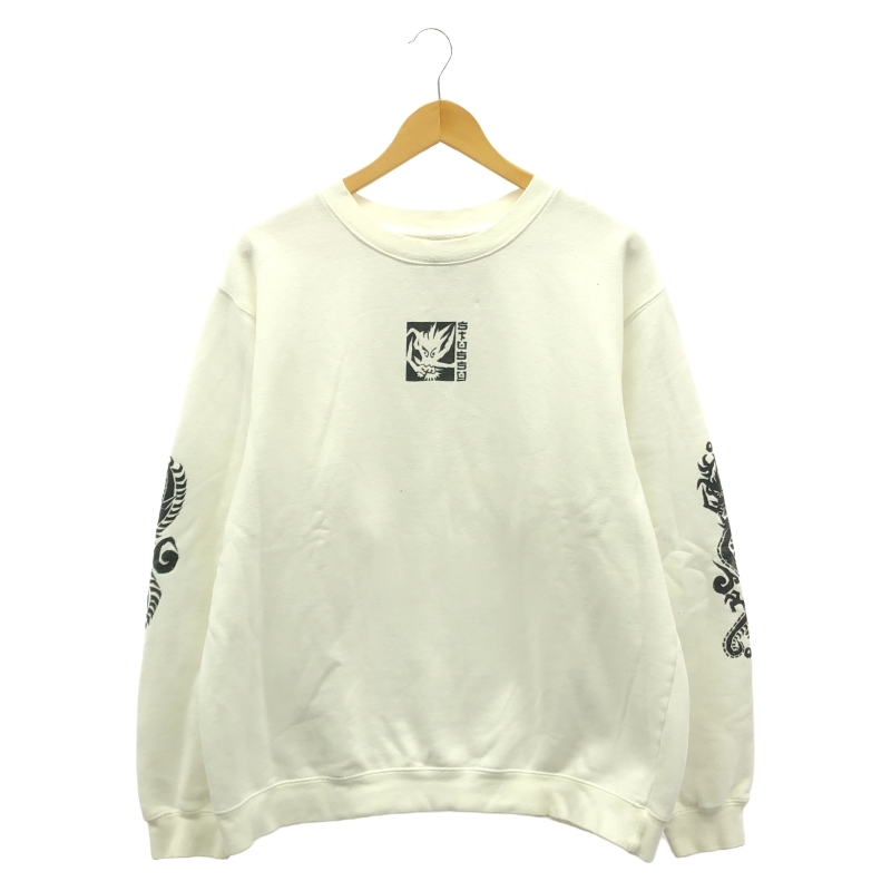 > 【中古】90s Stussy 版画風ドラゴンプリントスウェット 袖プリント サイズL ホワイト ステューシー[240017666327]