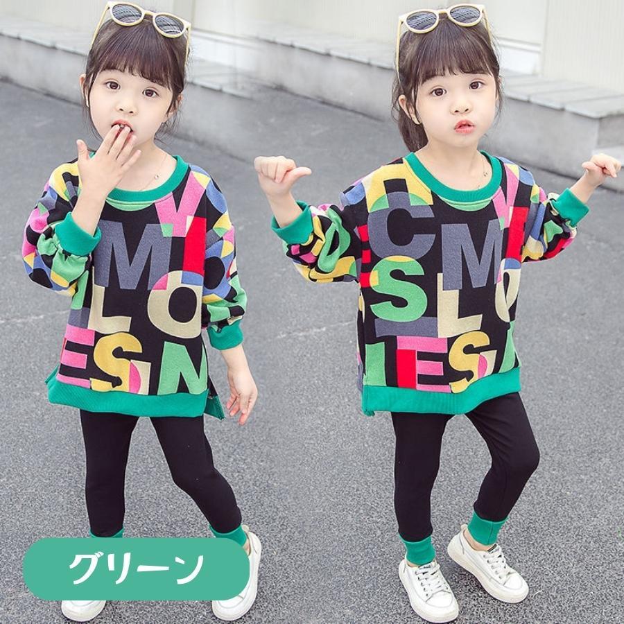- 新品 送料無料 グリーン 90cm カラフルロゴ トレーナー レギンス セットアップ 上下セット 春 秋 冬 スウェット ダンス服 韓国子供服